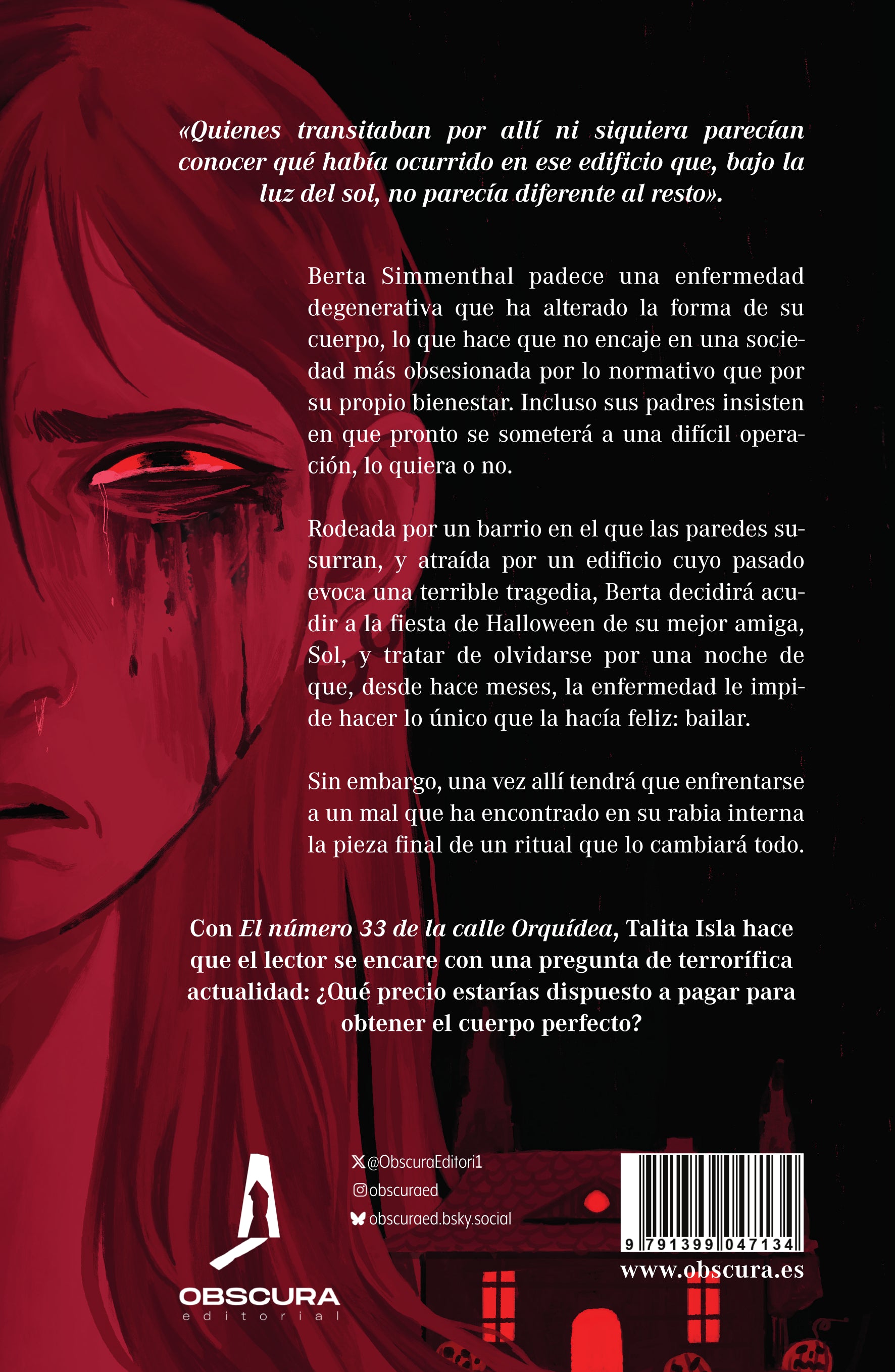 Con El número 33 de la calle Orquídea, Talita Isla hace que el lector se encare con una pregunta de terrorífica actualidad: ¿Qué precio estarías dispuesto a pagar para obtener el cuerpo perfecto?